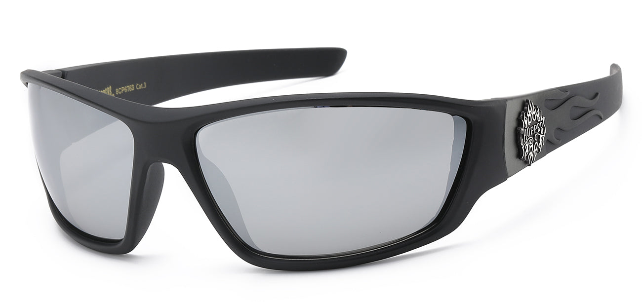 This brand new offering from Chopper sunglasses have a mid sized sleek contour wrap around design and a sloping frame structure for a face fitting design. Available in smoke and flash mirror lens package, these shades are perfect for riding and long term wear. Get them only at GotShades.com at competitive prices!